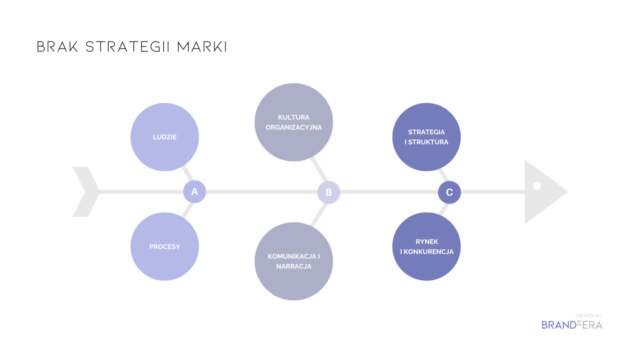 Na wykresie rybiej ości pokazujemy sześć głównych kategorii, które prowadzą do braku strategii marki i tłumaczą, dlaczego firmy dryfują, zamiast rozwijać się z intencją. Każdy z tych obszarów - od ludzi po rynek - wpływa na spójność, zdolność podejmowania decyzji i trwałość marki w czasie.